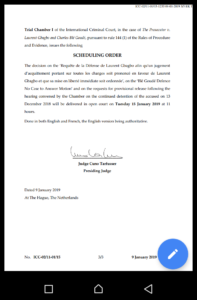 Sauf changement à la dernière minute, c’est ce mardi 15 janvier 2019 que ce fera l’acquittement de Gbagbo et  de Charles Blé Goudé. Un communiqué émanant de la cour suprême l’explique clairement.