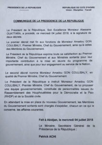 communiqué du gouvernement qui reconduit Gon Coulibaly